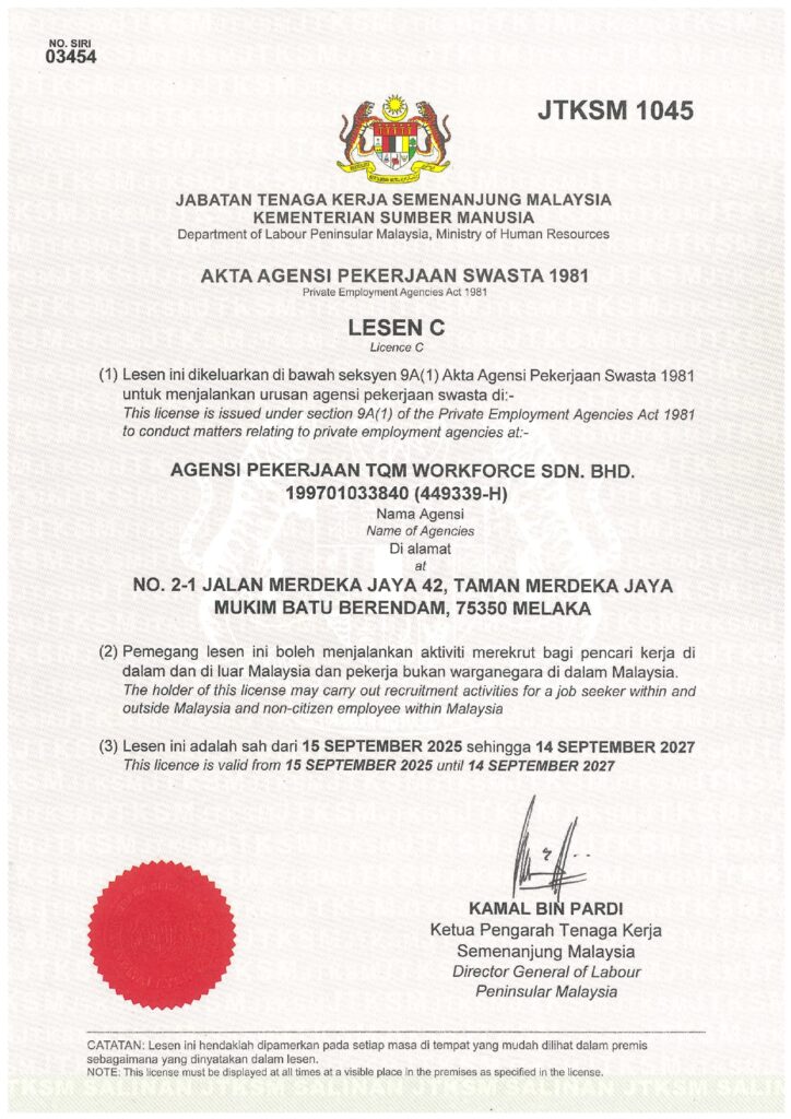 Established in Malaysia in 1997, Agensi Pekerjaan TQM Workforce Sdn Bhd has achieved consistent growth over the ensuing 34 years and is now a leading and most trusted afency in the provision of local and foreign manpower and personnel to various rapid growth industry in Malaysia. Buminur is 100% Bumiputra and fully managed by Malaysian partners / personnel with vast experience in the field and established working with various related agencies such as the Malaysian Ministry of Home Affairs (MOHA), Ministry of Foreign Affairs, Malaysian Labor Department, Malaysian Immigrations Department and Various Embassies.